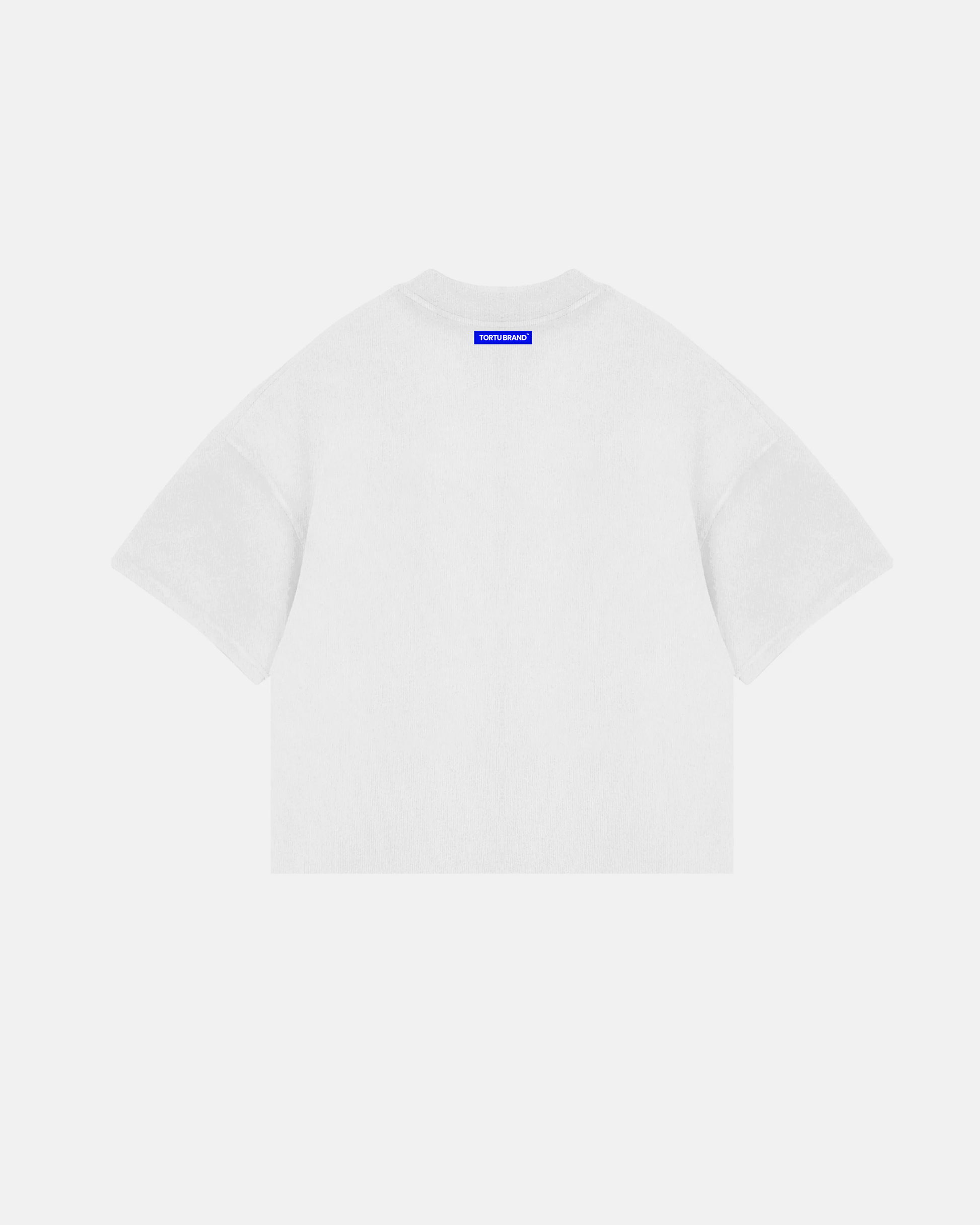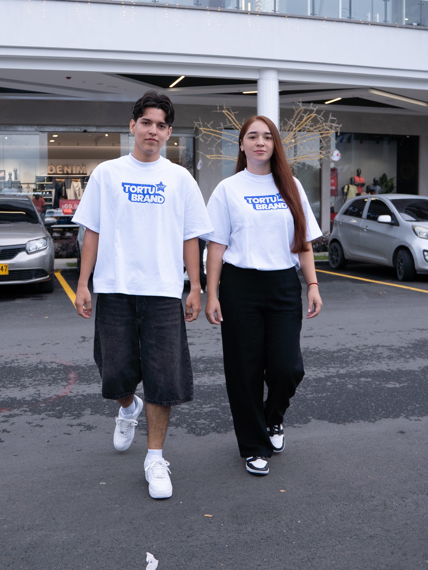 Camiseta Boxy Fit TORTU BRAND en color blanco, confeccionada en 100% algodón de alto gramaje (270 gsm). Presenta una silueta amplia con hombros caídos para un fit moderno. En la parte frontal cuenta con un estampado en serigrafía, mientras que en la espalda incorpora una marquilla azul en relieve con el nombre de la marca.