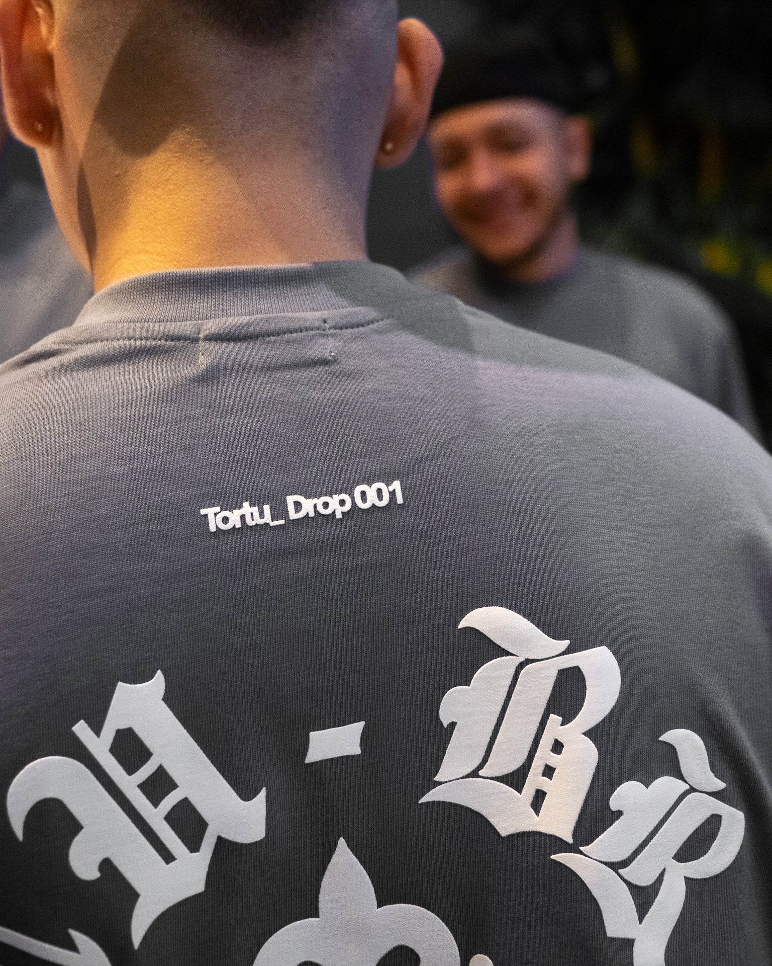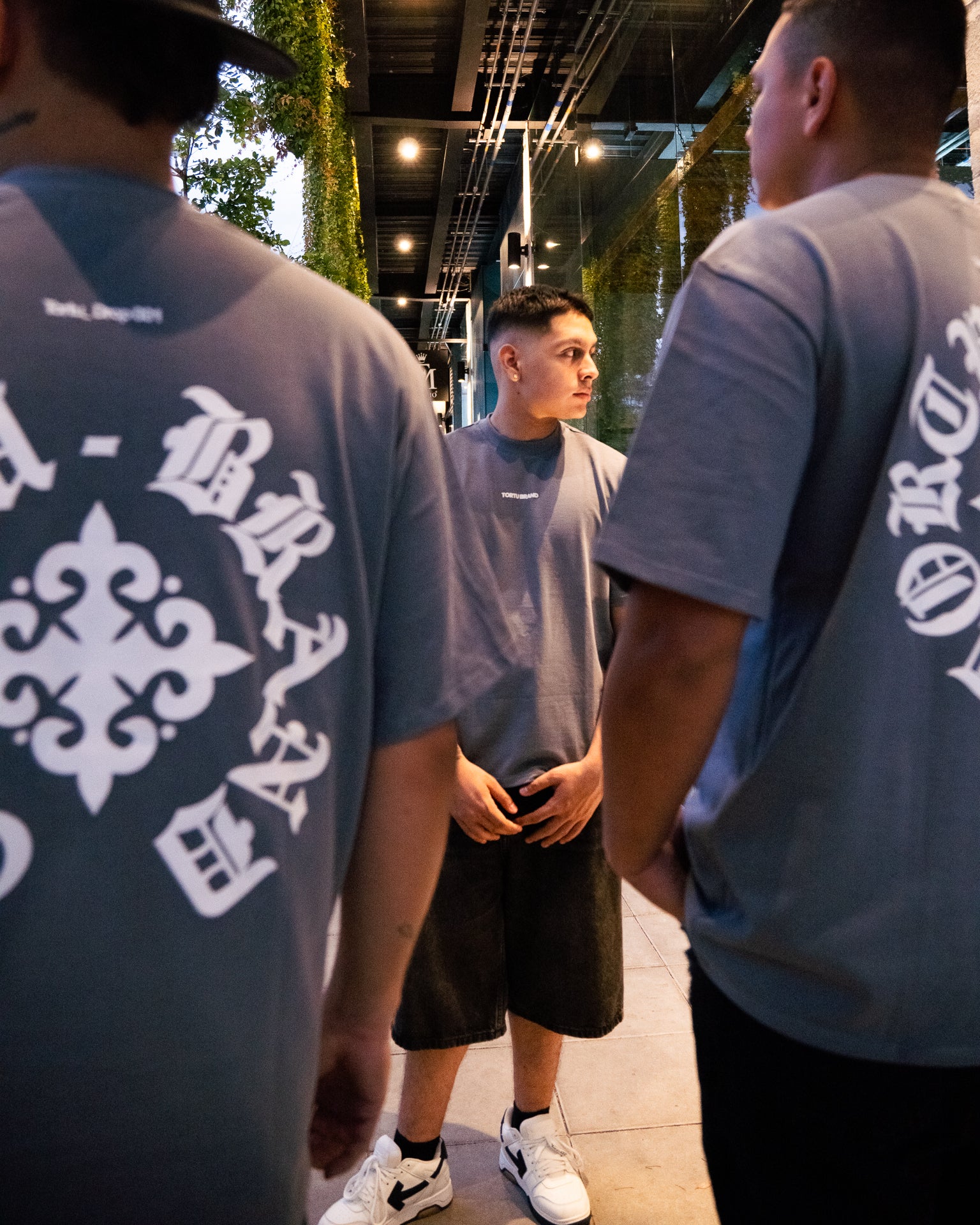 Camiseta Regular fit TORTU BRAND en color gris, confeccionada en 100% algodón de alto gramaje (270 gsm). Presenta una silueta amplia con hombros caídos para un fit moderno. En la parte frontal incorpora un estampado del logo en serigrafía de alta densidad, y en la parte posterior cuenta con un estampado en serigrafía de alta densidad